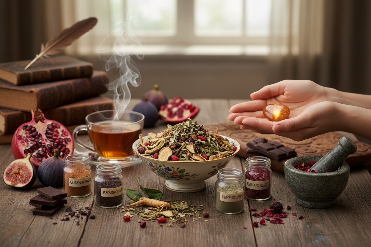 Maca peruwiańska (Lepidium meyenii) to jedyny suplement z powtarzalnymi wynikami w badaniach nad kobiecym pożądaniem — poprawia subiektywne libido niezależnie od zmian hormonalnych. Mechanizm jest nieznany, ale efekt obserwowany w kilku badaniach klinicznych z randomizacją. Ashwagandha obniża kortyzol i poprawia ogólne samopoczucie — co może pośrednio wspierać pożądanie u kobiet, u których stres jest głównym inhibitorem. Pozostałe składniki — tribulus, damiana, żeń-szeń — nie mają przekonujących dowodów w kontekście kobiecego libido.