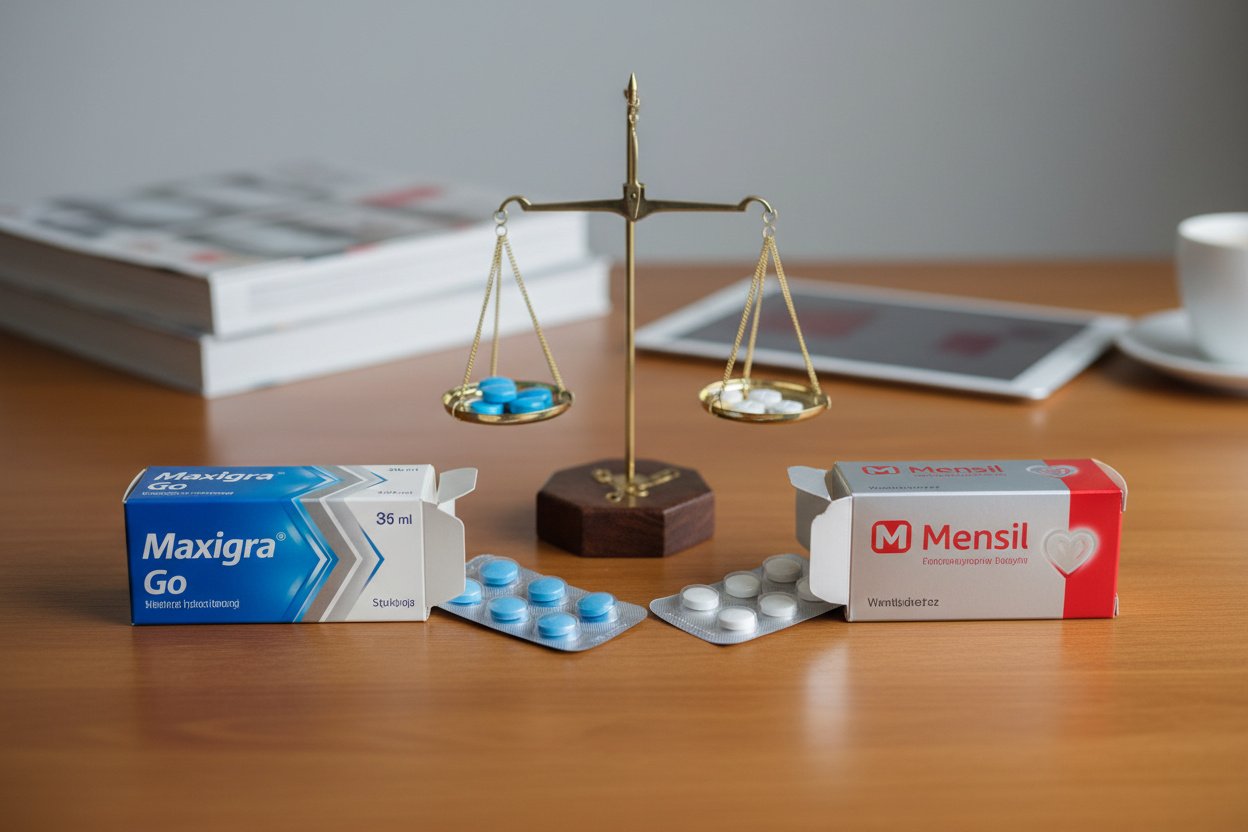 ToggleMaxigra Go i Mensil to dwa najpopularniejsze preparaty z sildenafilem 25 mg dostępne bez recepty w polskich aptekach. Oba oferują tę samą substancję czynną w tej samej dawce, oba są w formie tabletek do rozgryzania lub żucia, oba przeszły procedurę biorównoważności EMA — i oba kosztują zbliżone pieniądze. Na pierwszy rzut oka są niemal identyczne. To rodzi pytanie, które regularnie pojawia się na forach zdrowotnych: Maxigra Go czy Mensil — co wybrać? Czy jest jakaś realna różnica poza opakowaniem i nazwą?