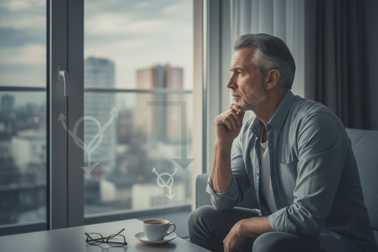 Objawy niedoboru testosteronu rozwijają się stopniowo — co paradoksalnie utrudnia ich rozpoznanie. Mężczyzna nie budzi się pewnego dnia z „andropauzą" — stopniowo zauważa zmiany, które przypisuje starzeniu, stresowi lub zmęczeniu. Kluczowe objawy obejmują trzy domeny.
