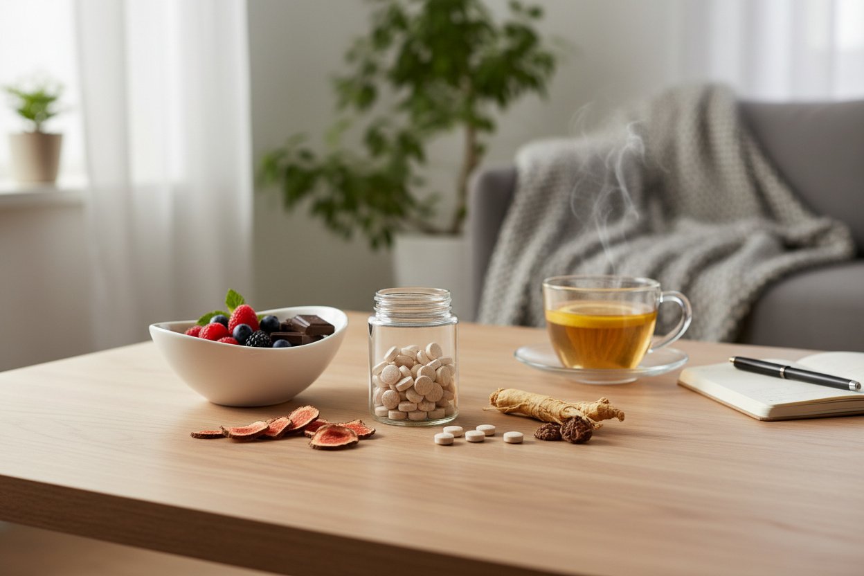 Maca peruwiańska (Lepidium meyenii, 1500-3000 mg dziennie) to suplement z najsilniejszymi dowodami w kontekście kobiecego libido. Badania kliniczne wykazują poprawę subiektywnego pożądania niezależną od zmian hormonalnych — mechanizm nieznany, ale efekt powtarzalny. Ashwagandha (300-600 mg dziennie) obniża kortyzol i poprawia ogólne samopoczucie — co może pośrednio wspierać libido u kobiet, u których stres jest głównym inhibitorem. Tribulus terrestris — popularny w suplementach na libido — nie ma przekonujących dowodów w kontekście kobiecego pożądania, mimo marketingowych twierdzeń producentów.